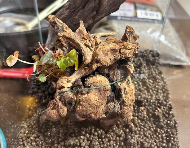 今回流木は真ん中に置くことを決めていましたが、どの角度で置くかなど、入れながら調整しました。また、ベゴニア デュードロップの根元にミズゴケを巻き、流木に活着させるようモスコットン(アクアリウム用の糸)で固定しています。